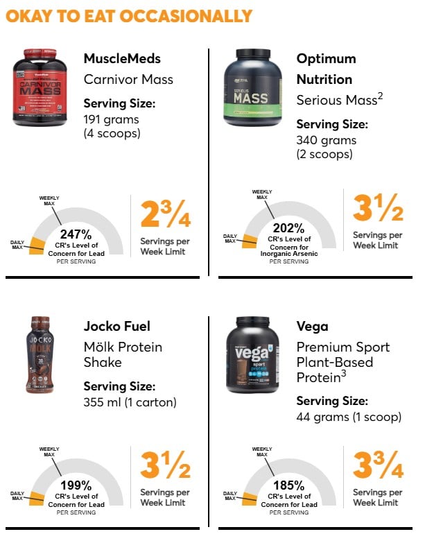 Η έκθεση αναφέρει επίσης ότι δεν υπάρχει θέμα να καταναλώνετε περιστασιακά τις εξής σκόνες πρωτεΐνης: