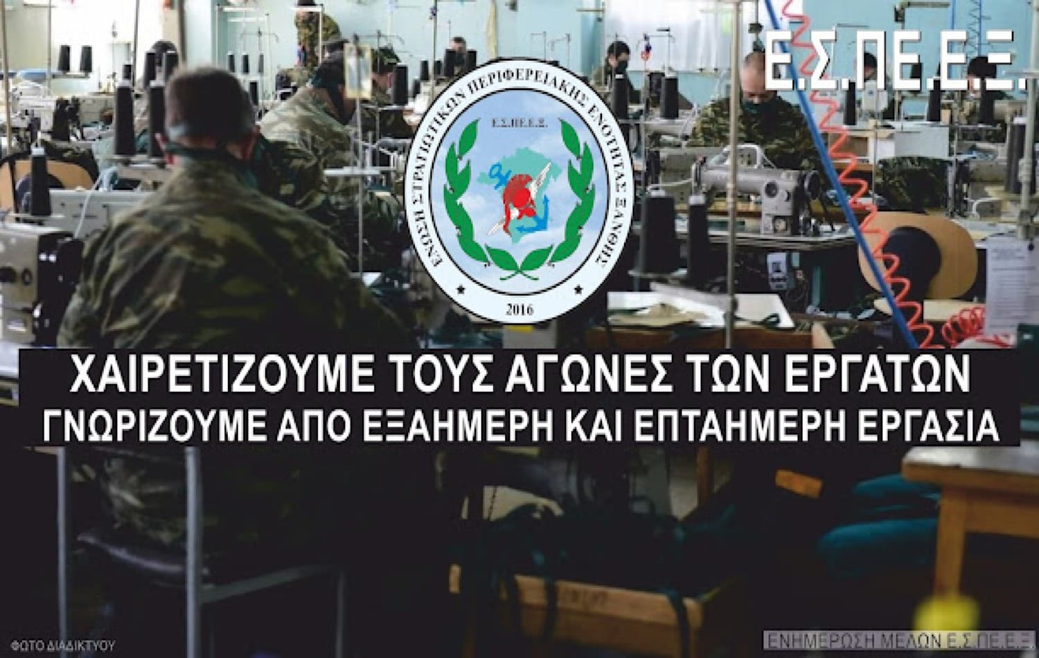 Η Ένωση Στρατιωτικών Περιφερειακής Ενότητας Ξάνθης (ΕΣΠΕΕΞ) εξέδωσε δελτίο Τύπου με θέμα: «Χαιρετίζουμε τους αγώνες ενάντια στην 6ήμερη εργασία. Γνωρίζουμε από ελαστικά υπερωράρια χωρίς αποζημίωση».