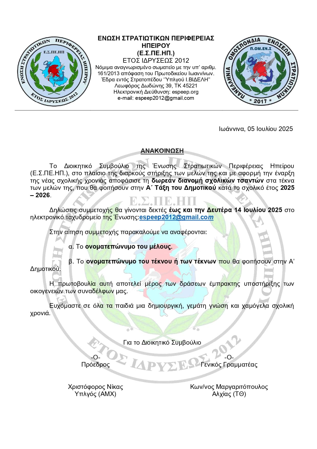 Η Ένωση Στρατιωτικών Περιφέρειας Ηπείρου (ΕΣΠΕΗΠ) εξέδωσε ανακοίνωση με τίτλο: Δωρεάν διανομή σχολικών τσαντών για τα πρωτάκια του 2025-2026.