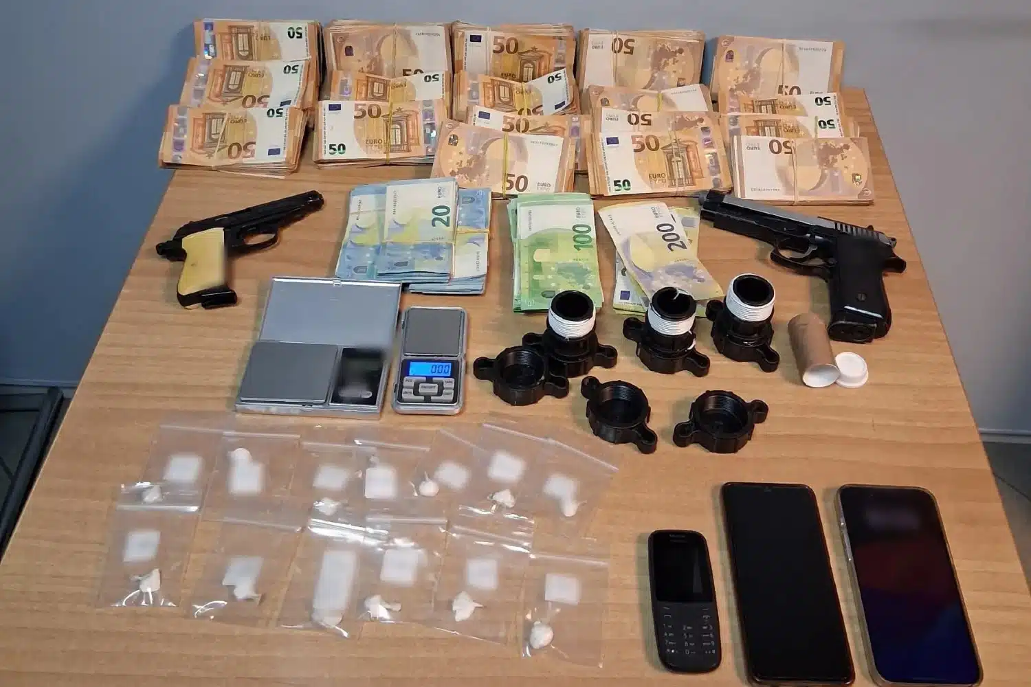 Κατασχέθηκαν περισσότερα από 100.000 ευρώ, κοκαΐνη, ζυγαριές ακριβείας και δύο πιστόλια.