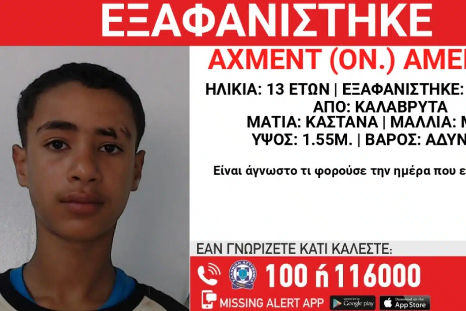 Εξαφανίστηκε το απόγευμα της Κυριακής (26/10) από χώρο φιλοξενίας ασυνόδευτων ανηλίκων στην περιοχή των Καλαβρύτων, ο Αχμέντ Αμέν, 13 ετών, αιγυπτιακής καταγωγής.