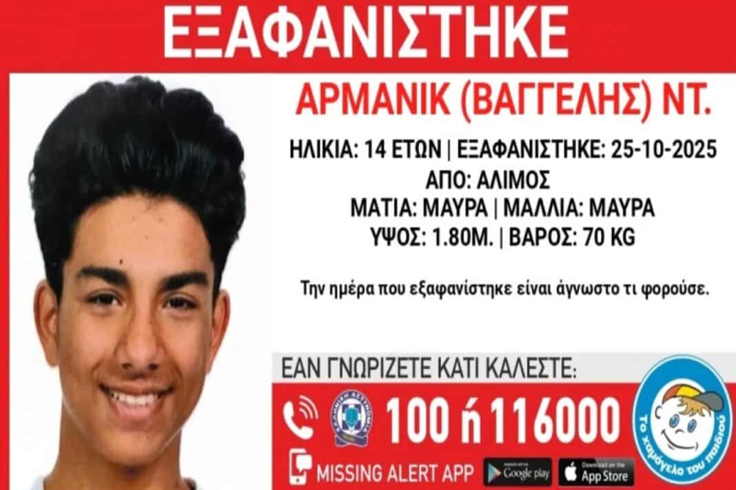 Στις 25/10/2025 στις 01:40 το πρωί εξαφανίστηκε από χώρο παιδικής προστασίας στην περιοχή του Αλίμου ο Αρμανίκ (Βαγγέλης) Ντ., 14 ετών.