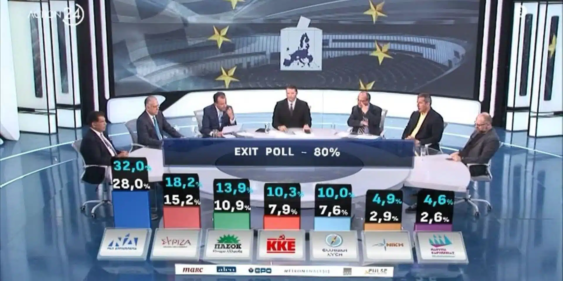 Η Νέα Δημοκρατία λαμβάνει ποσοστό από 28% έως 32% και άρα κερδίζει 7-8 έδρες.