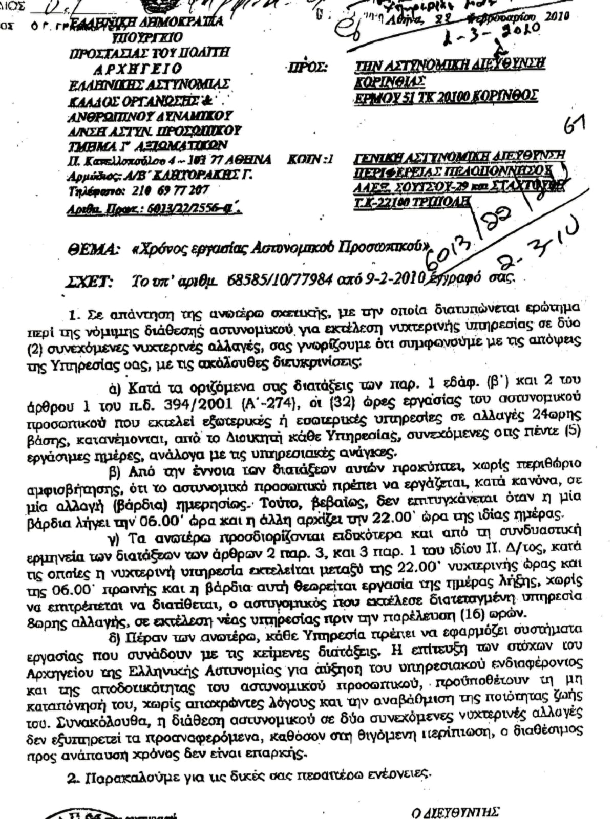 Τα διπλά συνεχόμενα νυχτερινά ωράρια εργασίας απαγορεύονται σε μόνιμη συνεχόμενη κυκλική βάση εργασίας, βάσει σχετικής Διαταγής από το Αρχηγείο Ελληνικής Αστυνομίας που εκδόθηκε το 2010, διότι είναι επικίνδυνα και για τον Αστυνομικό και για την απόδοσή τους, και μόνο σε εξαιρετικές σοβαρές και έκτακτες περιπτώσεις δύναται να εκτελούνται υπηρεσίες σε διπλή νυχτερινή εργασία, αλλά και πάλι τίθενται σοβαρά ζητήματα όσον αφορά τη νομιμότητά τους.