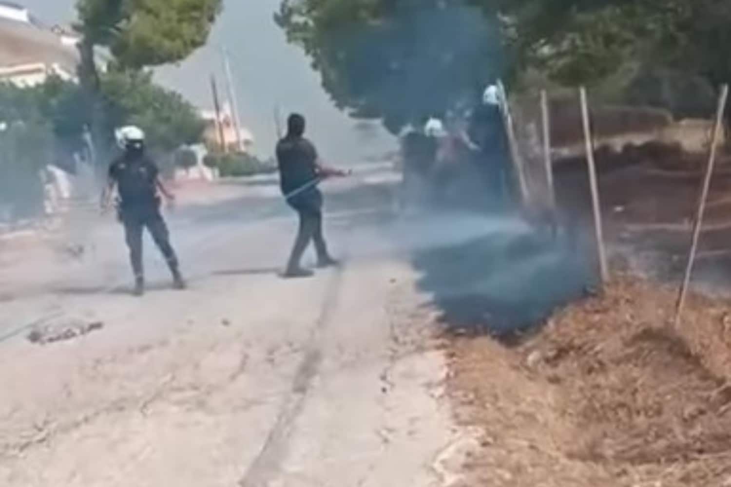 Είναι χαρακτηριστικό πως αστυνομικοί με μάνικες στα χέρια επιχειρούν στις φωτιές και βοηθούν την κατάσταση.