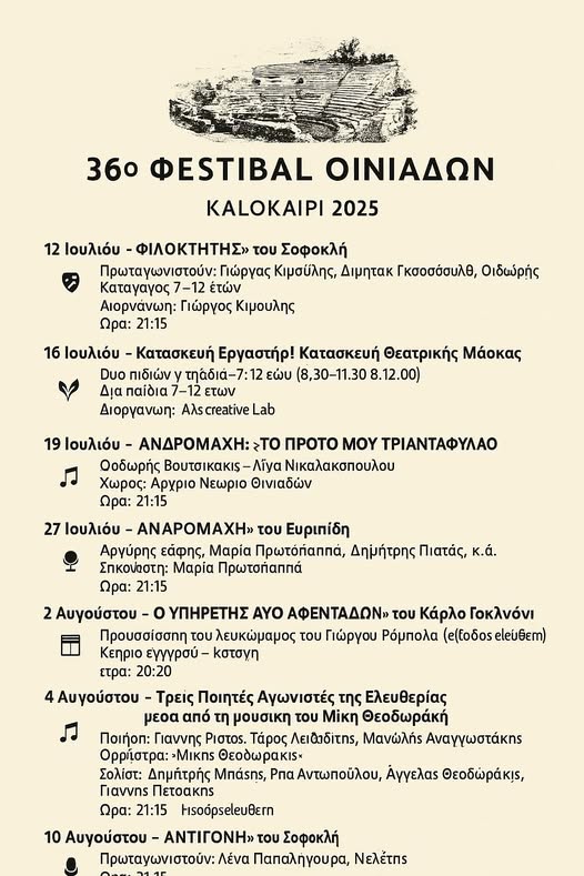 Το πρόγραμμα του 36ου Φεστιβάλ Οινιαδών – Καλοκαίρι 2025 περιλαμβάνει τις εξής εκδηλώσεις: