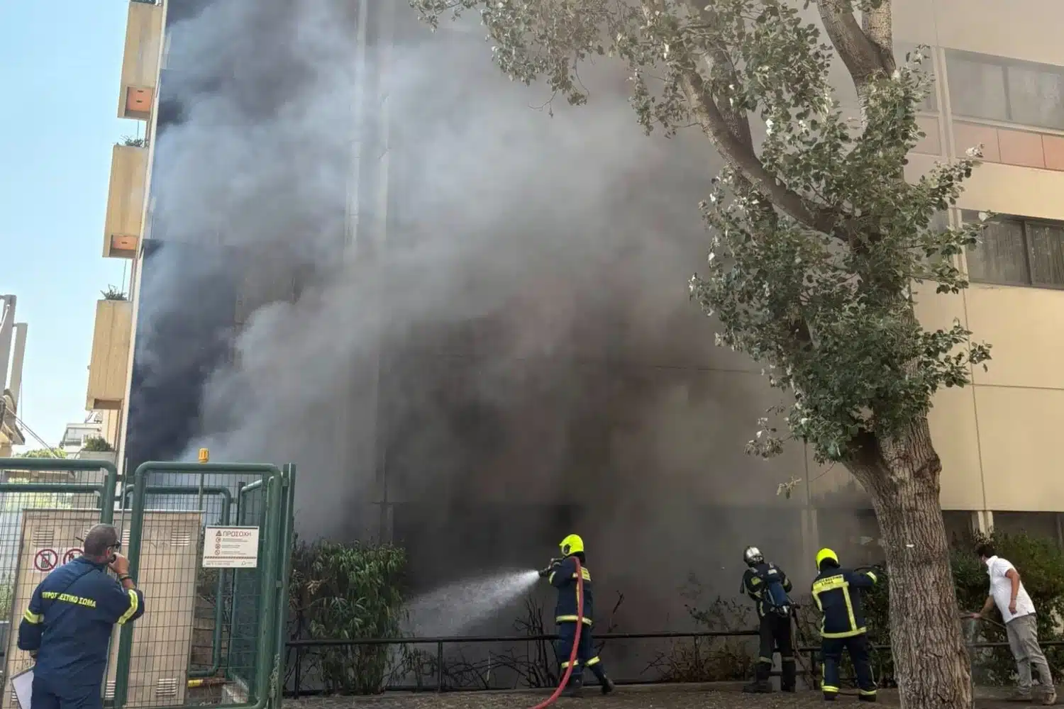 Εργαζόμενοι και ασθενείς, πολλοί εξ’αυτών με τους ορούς τους, έχουν εκκενώσει με ασφάλεια το κτήριο και έχουν βγει στον προαύλιο χώρο.