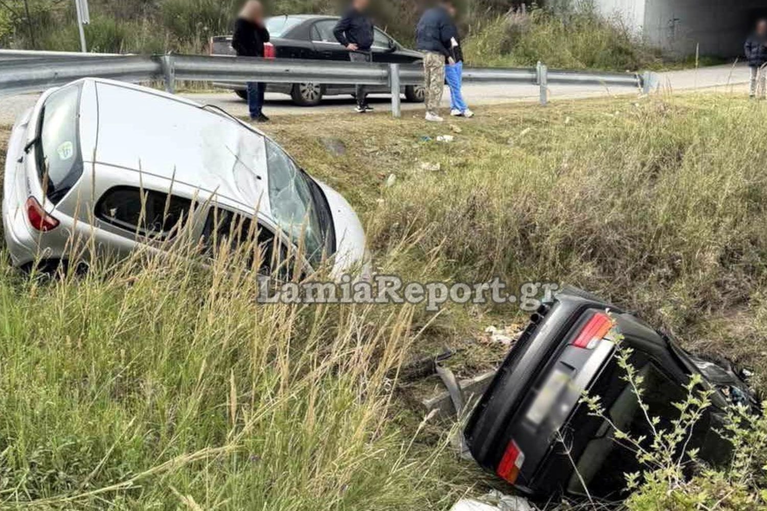 Όπως βλέπετε και στις φωτογραφίες του LamiaReport τα δύο αυτοκίνητα μετά τη σύγκρουση «πέταξαν» πάνω από τις μπάρες και προσγειώθηκαν μέσα στα χωράφια και συγκεκριμένα σε σούδα, που για καλή τους τύχη δεν είχε νερό.