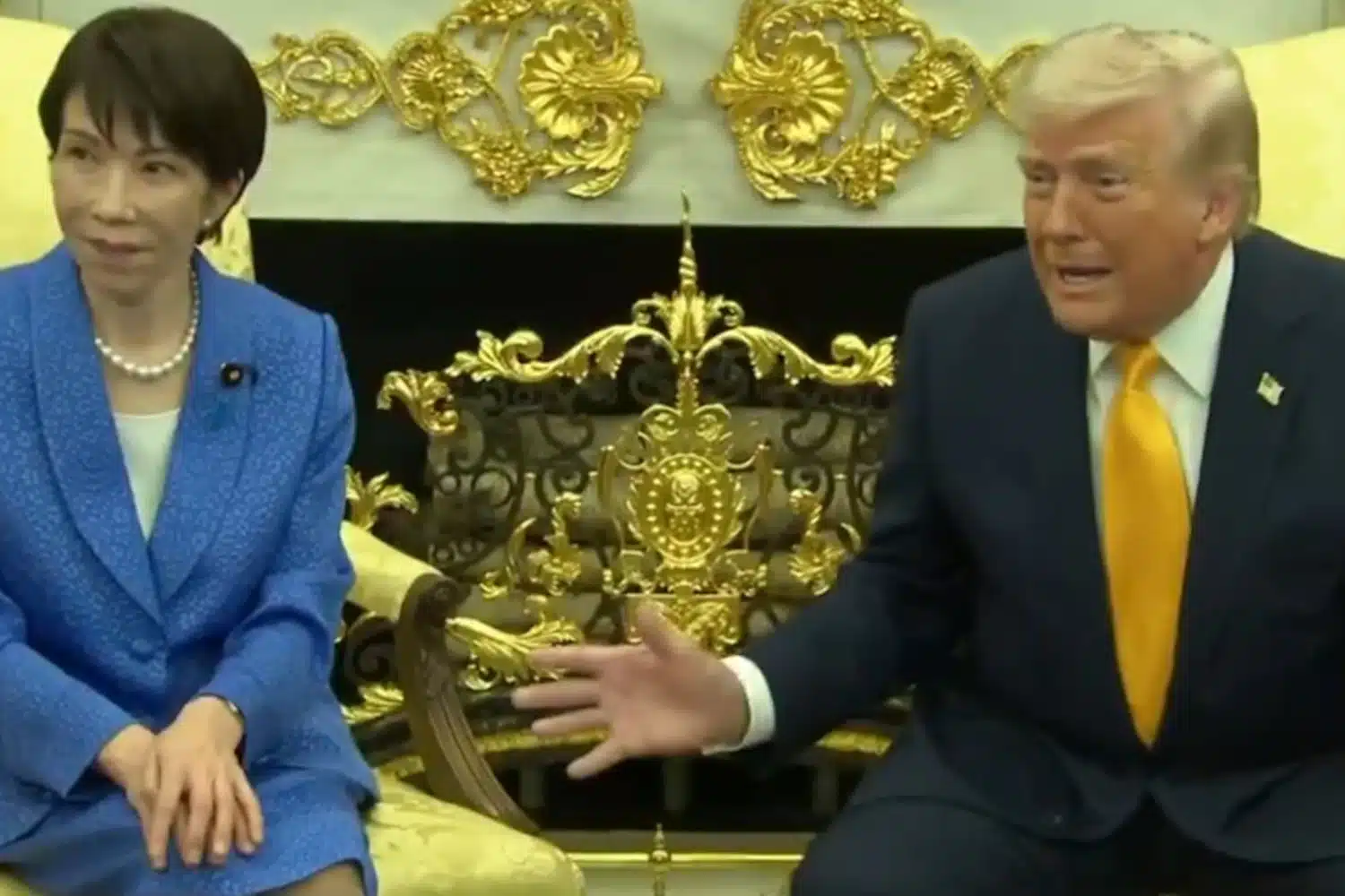 Η αναφορά αυτή προκάλεσε την ορατή δυσφορία της Ιαπωνίδας πρωθυπουργού, η οποία αντέδρασε με έναν ανεπαίσθητο αναστεναγμό και μια κίνηση αποστασιοποίησης.