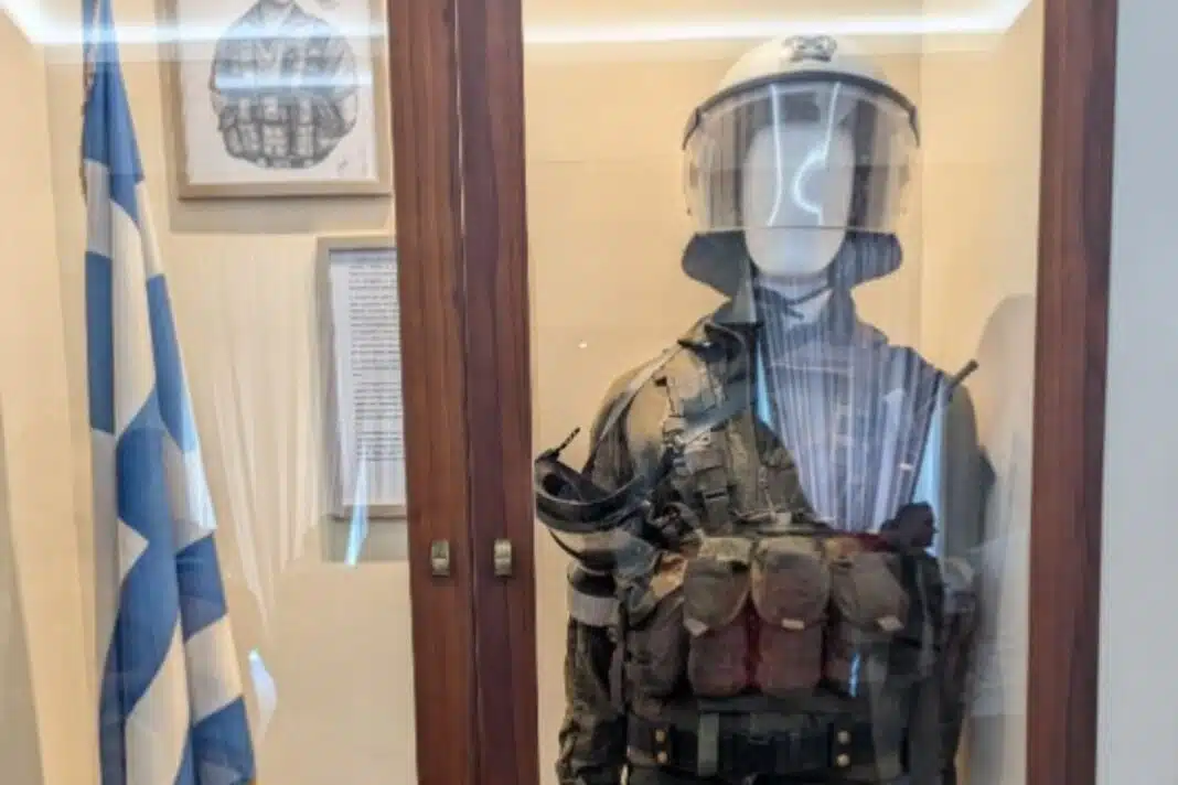 Η τιμητική προθήκη στο Μουσείο φιλοξενεί τη στολή που φορούσε το βράδυ της δολοφονικής επίθεσης – ένα αυθεντικό, βαρύ συμβολικό τεκμήριο της θυσίας του.