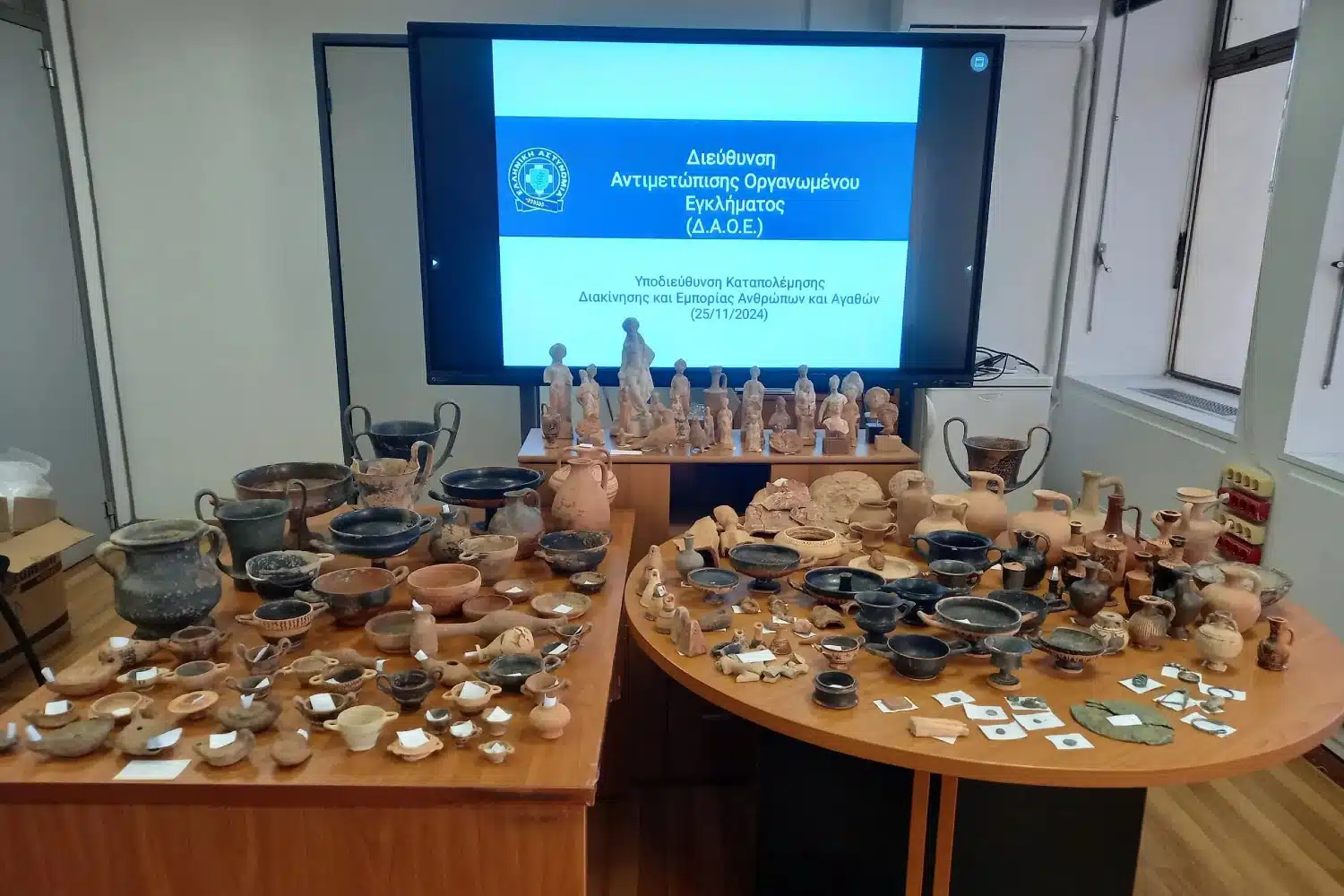 Ενδεικτικά, κατασχέθηκαν κύλικες, φιαλίδια, λήκυθοι, πήλινα ειδώλια και ομοιώματα, πρόχοι, μικρογραφικοί σκύφοι αρχαϊκής και κλασικής/ελληνιστικής περιόδου, πήλινοι λύχνοι ρωμαϊκών/βυζαντινών χρόνων, χάλκινα και αργυρά νομίσματα, καθώς και θραύσματα κεραμικής.