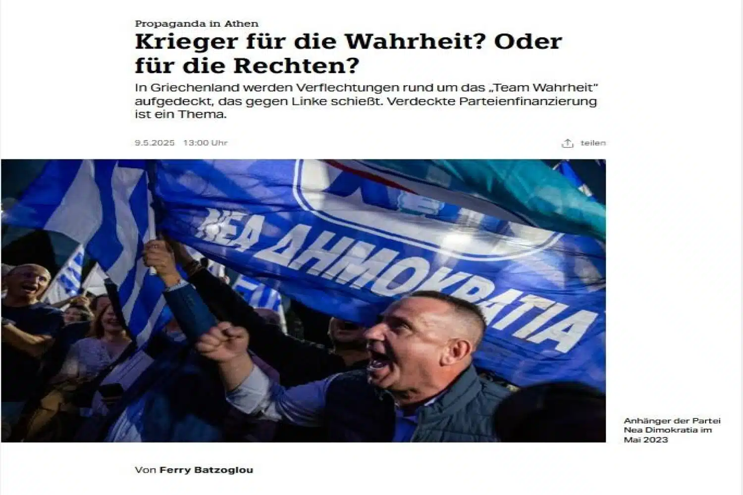 Η γερμανική εφημερίδα Taz, μετά τα σχετικά άρθρα σε Politico, Liberation, Euractiv, ασχολήθηκε με τις αποκαλύψεις για την «Ομάδα Αλήθειας» της Νέας Δημοκρατίας, που σε κάθε ευρωπαϊκή χώρα, πλην της Ελλάδας, θα ήταν αρκετές για να κινηθεί έρευνα των Εισαγγελικών Αρχών.