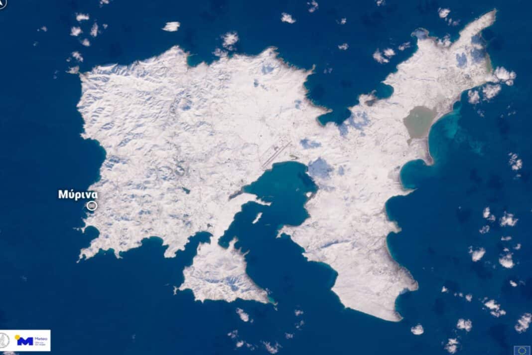 Η παρακάτω δορυφορική εικόνα, που ελήφθη από τον ευρωπαϊκό δορυφόρο Sentinel-2 το μεσημέρι της Πέμπτης 1 Ιανουαρίου 2026, αποτυπώνει την εντυπωσιακή εικόνα της πάλλευκης Λήμνου, η οποία θυμίζει σκηνές από τον Αρκτικό Κύκλο.