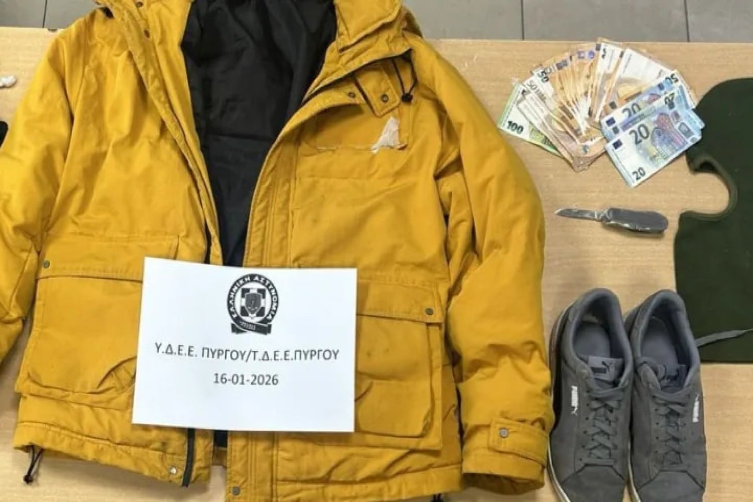 Σε έρευνες που ακολούθησαν, έπειτα από υπόδειξη του ίδιου, οι αστυνομικοί εντόπισαν μέσα σε κάδο απορριμμάτων στον Πύργο το μπουφάν που φορούσε κατά τη διάρκεια της ληστείας, καθώς και το μαχαίρι – σουγιά που χρησιμοποίησε.