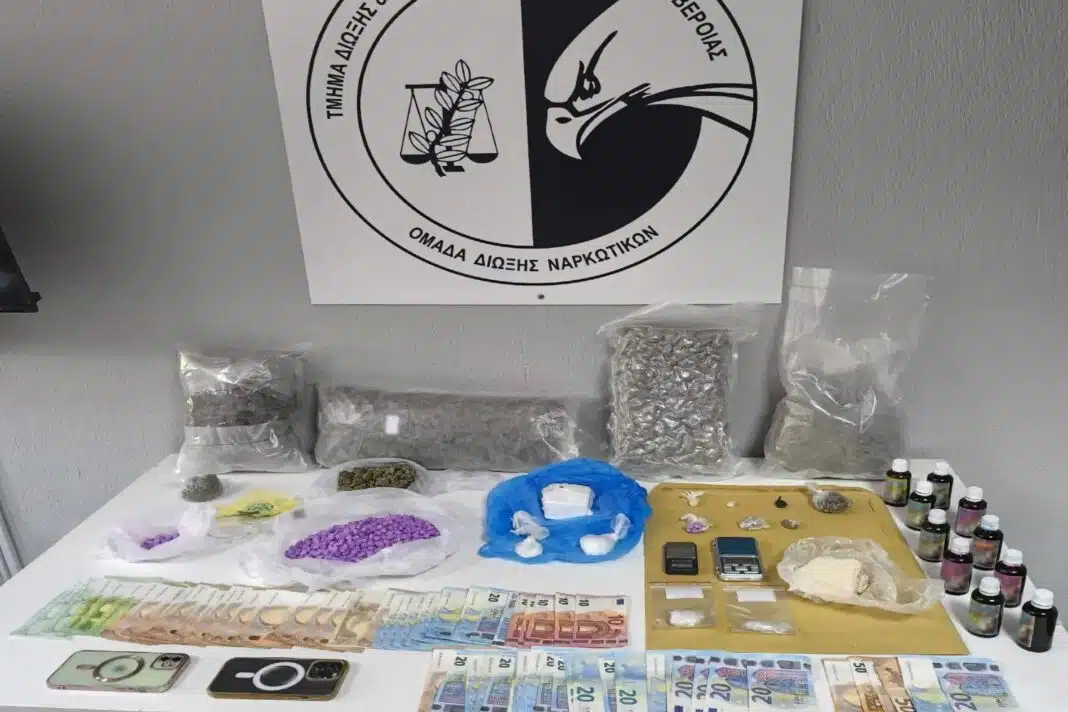 Συνολικά κατασχέθηκαν 10 συσκευασίες με ακατέργαστη κάνναβη βάρους 2 κιλών και 380,64 γραμμαρίων, 4 συσκευασίες με κοκαΐνη βάρους 194,67 γραμμαρίων, 1.839 ναρκωτικά δισκία, 5 συσκευασίες με κρυσταλλική μεθαμφεταμίνη (MDMA) βάρους 142,69 γραμμαρίων, 10 φιαλίδια με κωδεΐνη των 50ml το καθένα, το χρηματικό ποσό των 2.690 ευρώ, 2 ηλεκτρονικές ζυγαριές ακριβείας και 2 κινητά τηλέφωνα.