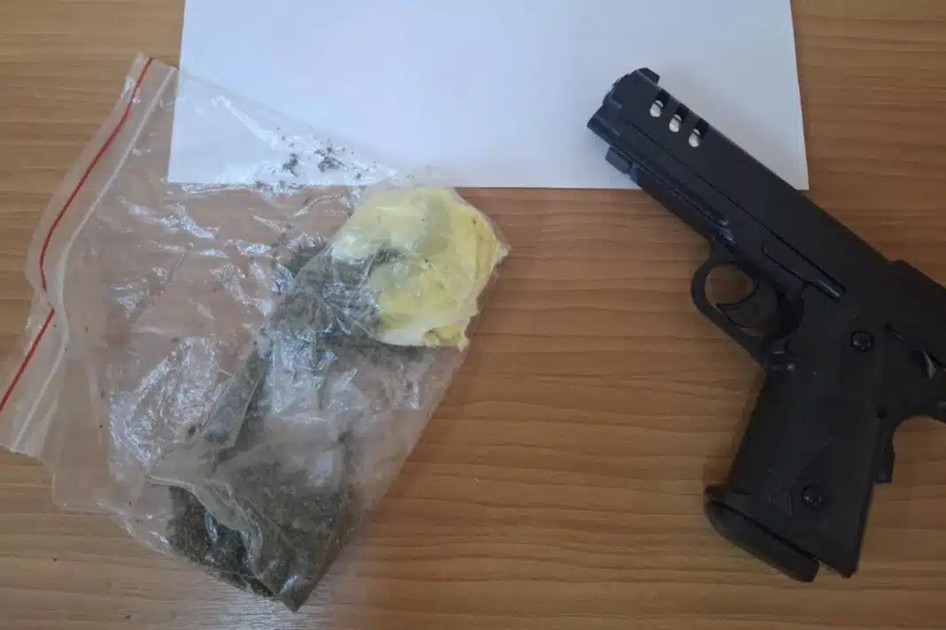Στη δεύτερη περίπτωση, από αστυνομικούς του Τμήματος Δίωξης και Εξιχνίασης Εγκλημάτων Αλεξάνδρειας, εντοπίστηκε πάλι σε περιοχή της Ημαθίας ένας 26χρονος άνδρας να επιβαίνει σε όχημα και στην κατοχή του βρέθηκε και κατασχέθηκε 1 συσκευασία με ακατέργαστη κάνναβη βάρους 15,1 γραμμαρίων και 1 πλαστικό πιστόλι «ρέπλικα».