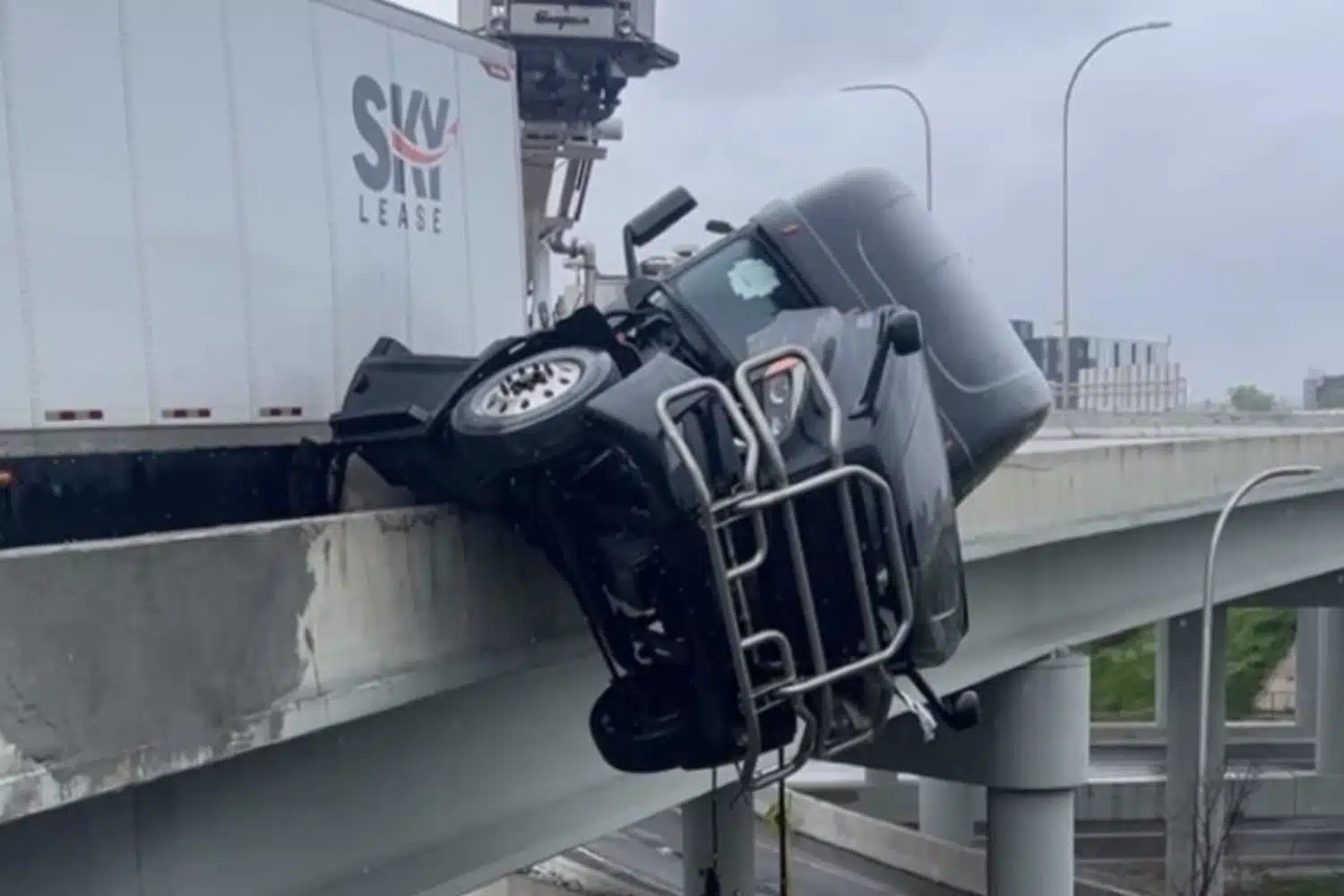 Τις στιγμές αγωνίας που έζησε ένας οδηγός στις ΗΠΑ όταν το φορτηγό του βρέθηκε στο κενό μετά από τροχαίο σε γέφυρα έδωσε στη δημοσιότητα το αστυνομικό τμήμα της πόλης Λούιβιλ.