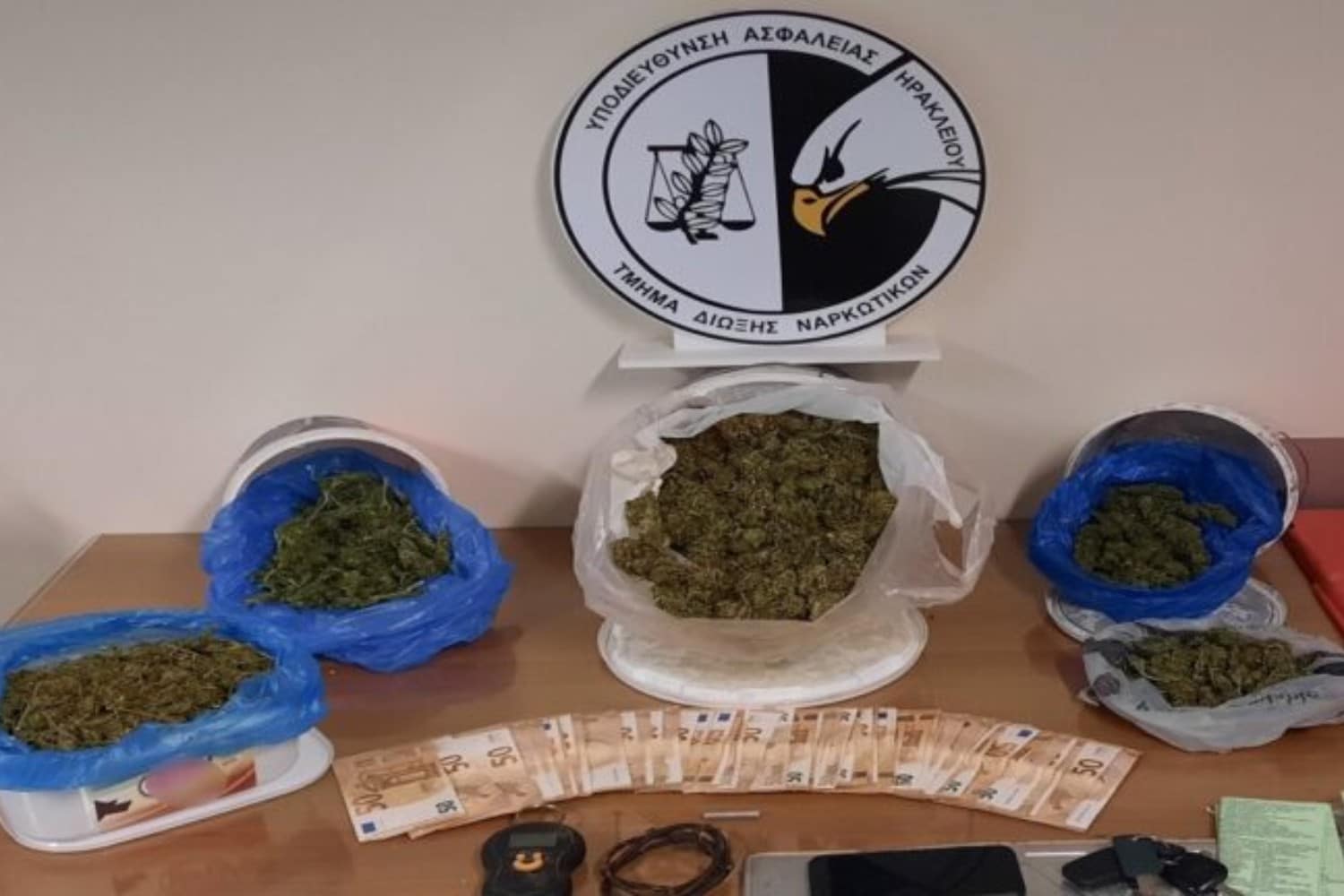 Συνολικά κατασχέθηκαν 1 κιλό και 413 γραμμάρια κάνναβη,  μία ηλεκτρονική ζυγαριά ακριβείας, το χρηματικό ποσό των δύο χιλιάδων εννιακοσίων (2.900) ευρώ, ένας πυροκροτητής με βραδύκαυστο φιτίλι, ένα κινητό τηλέφωνο και δύο οχήματα ως μέσα διακίνησης ναρκωτικών ουσιών.