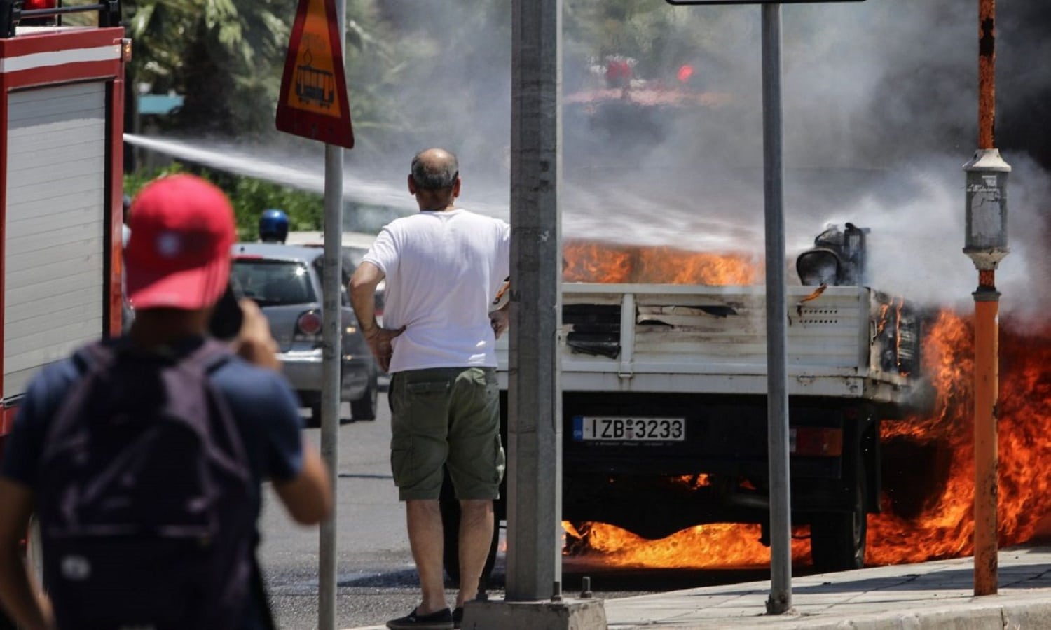 Το δεύτερο περιστατικό συνέβη λίγο μετά τις 5:10 το απόγευμα στις Τρεις Εκκλησιές όταν ένα όχημα τυλίχτηκε στις φλόγες εν… κινήσει.