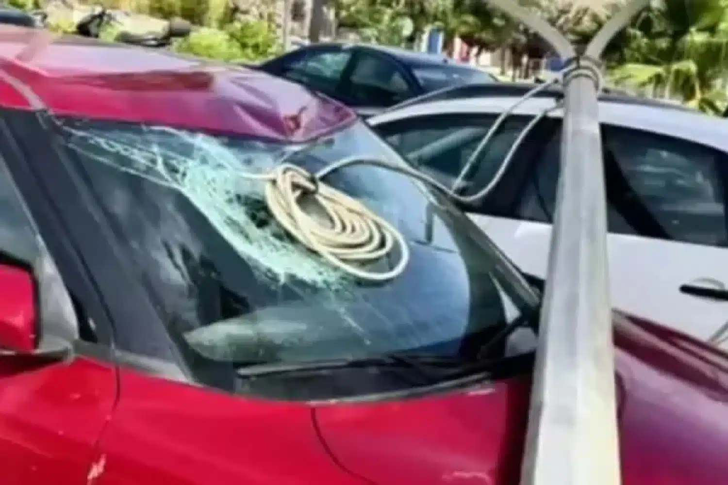 Σύμφωνα με το cretalive.gr η κολόνα ξηλώθηκε λόγω των ισχυρών ανέμων, με αποτέλεσμα να πέσει πάνω στο αυτοκίνητο και να προκαλέσει τεράστιες υλικές ζημιές.