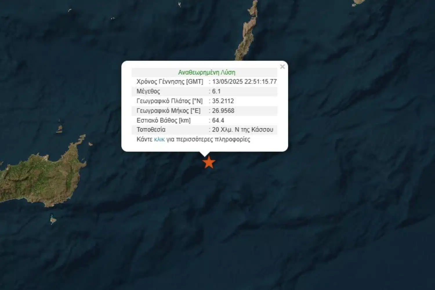 Ισχυρή σεισμική δόνηση 6,1 Ρίχτερ σημειώθηκε στις 01:50 τα ξημερώματα της Τετάρτης (14/5) μεταξύ Κάσου και Καρπάθου, σύμφωνα με την αναθεωρημένη λύση του Γεωδυναμικού Ινστιτούτου.