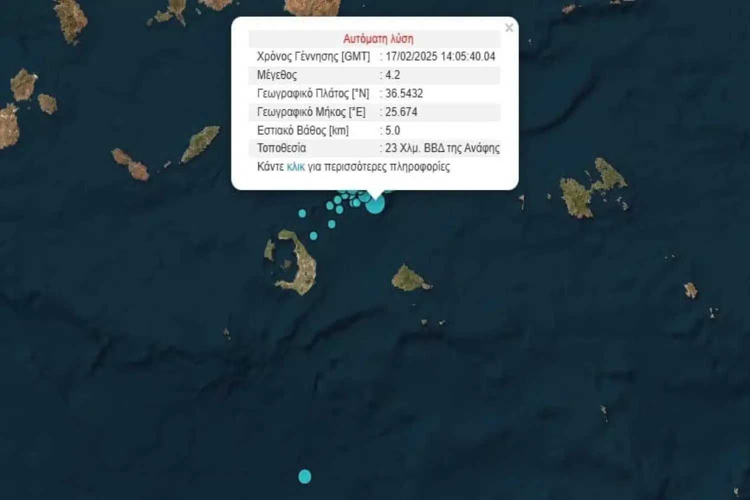 Ισχυρός σεισμός εκδηλώθηκε το μεσημέρι της Δευτέρας (17/2) βόρεια-βορειοδυτικά της Ανάφης.