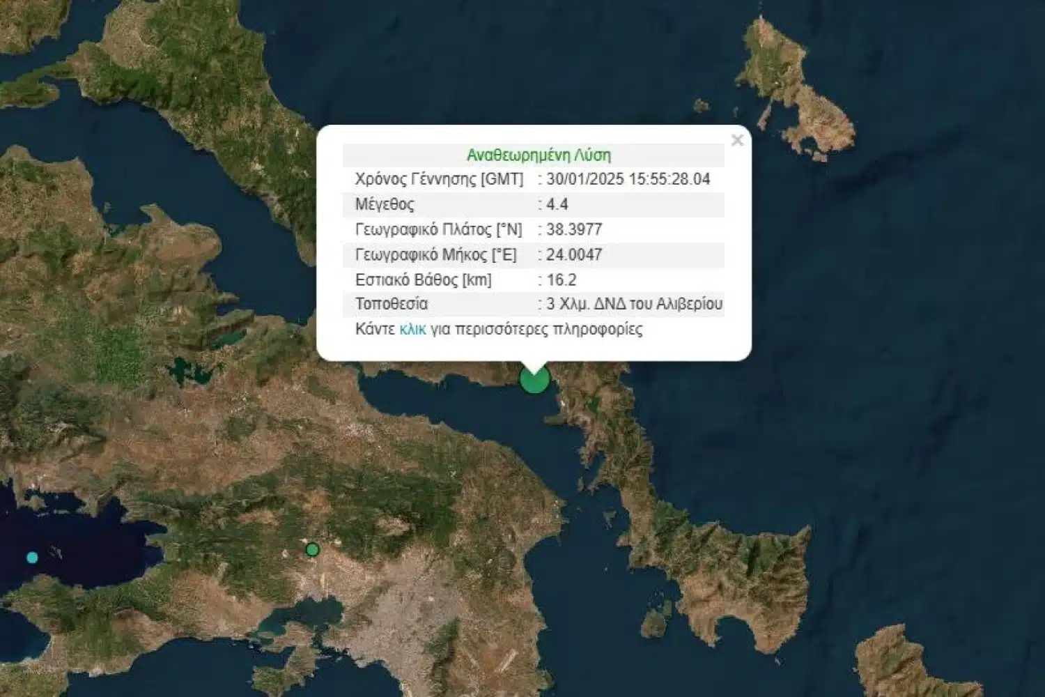 Ειδικότερα, σύμφωνα με την αναθεωρημένη λύση του Γεωδυναμικού Ινστιτούτου ο σεισμός σημειώθηκε στις 17.55 με το επίκεντρο να εντοπίζεται 3 χιλιόμετρα δυτικά – νοτιοδυτικά του Αλιβερίου και εστιακό βάθος 16,2 χιλιόμετρα.