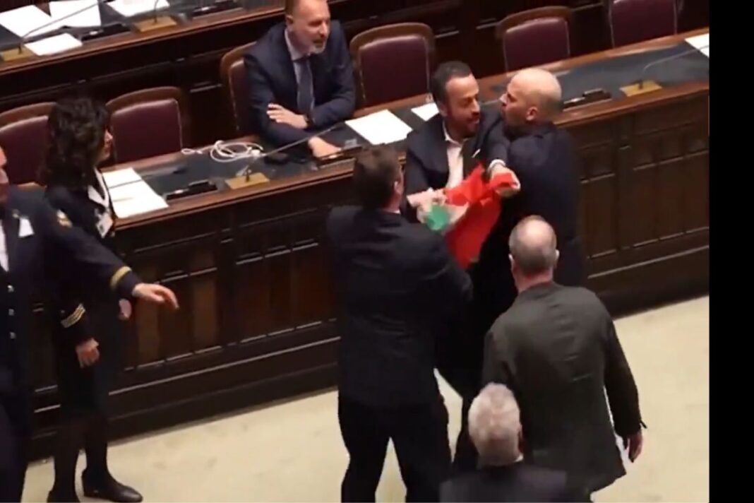 autonomia differenziata, discussione alla Camera…Donno (M5S) srotola il tricolore davanti a Calderoli…rissa furibonda…poi arriva lo squadrista leghista Iezzi che sferra ripetuti pugni…