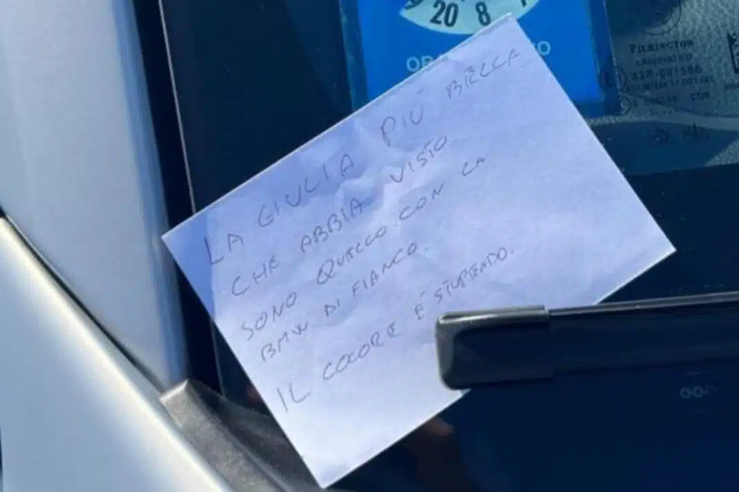 Όλα ξεκίνησαν όταν ο οδηγός της εντυπωσιακής Giulia επέστρεψε στο σημείο που είχε σταθμεύσει το αυτοκίνητό του και παρατήρησε ένα χαρτί κολλημένο στο παρμπρίζ. Όπως ήταν φυσικό, η πρώτη του σκέψη ήταν ότι επρόκειτο για κλήση λόγω παράνομου παρκαρίσματος.