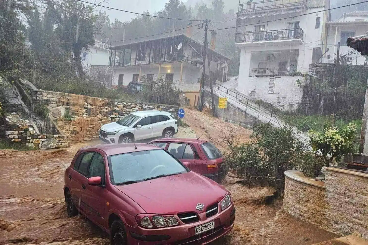 Στην Ποταμιά, στα ανατολικά του νησιού, δρόμοι μέσα στο χωριό ξηλώθηκαν ενώ πλημμύρισαν ισόγεια και αποθήκες.