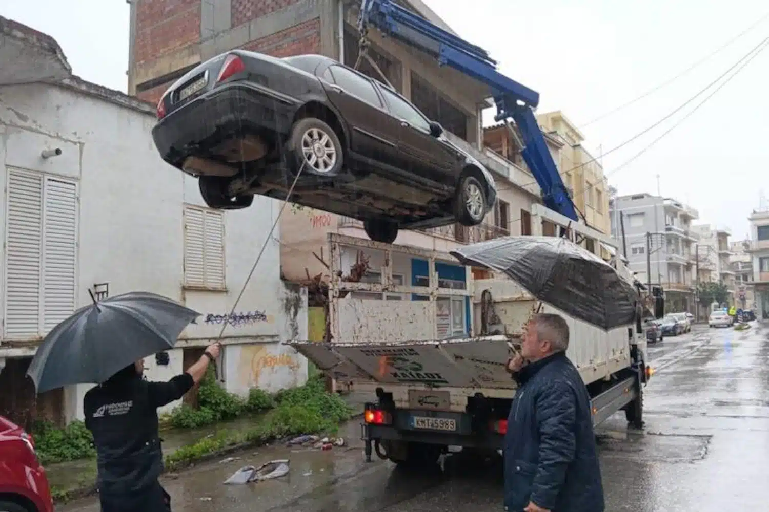 Απομακρύνθηκε χθες, υπό βροχή, από συνεργεία του Δήμου Καλαμάτας το εγκαταλελειμμένο αυτοκίνητο που παρέμενε επί τουλάχιστον δέκα χρόνια στην οδό Ρουμελιώτη, μεταξύ Βύρωνος και Φαρών, στο κέντρο της πόλης.
