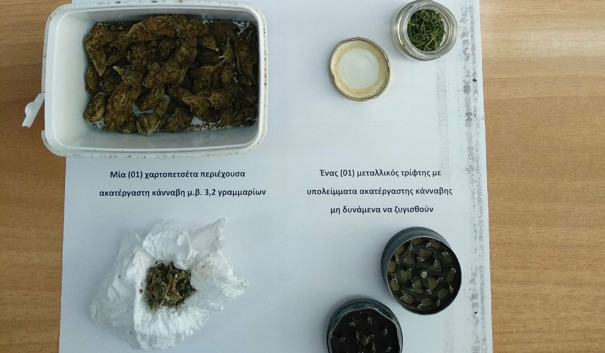 Ειδικότερα, έπειτα από αξιοποίηση πληροφοριών, τα ανωτέρων στελέχη εντόπισαν τον νεαρό πλησίον της οικίας του, να έχει στην κατοχή του ποσότητα ακατέργαστης κάνναβης μέσα σε χαρτοπετσέτα, μικτού βάρους 3,2 γραμμαρίων.