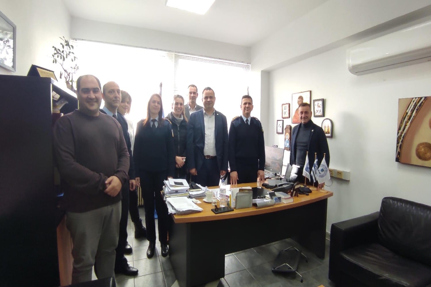Γνωρίζεται ότι την Τρίτη 25 Φεβρουαρίου 2025, αντιπροσωπεία της Ένωσης Αξιωματικών Ελληνικής Αστυνομίας Ανατολικής Μακεδονίας και Θράκης, αποτελούμενη από τον Πρόεδρο Παπαθεμελή Άγγελο, τον Γενικό Γραμματέα Ντεληγιάννη Πέτρο, τον Αντιπρόσωπο στην ΠΟΑΞΙΑ Κοψίδα Αθανάσιο, τα μέλη της Γραμματείας Γυναικών Μπέλλου Αλεξάνδρα, Κόρμπου Παρασκευή, Γρηγοριάδου Αικατερίνη και το μέλος της Γραμματείας Ανθ/μων-Αξιωματικών του Ν. 3686/2008 Κεσεδάρογλου Νικόλαο, πραγματοποίησε θεσμική εθιμοτυπική συνάντηση στην Καβάλα με τον Διευθυντή της Διεύθυνσης Αστυνομίας Καβάλας, Αστυνομικό Διευθυντή κ. Σιμούδη Κωνσταντίνο.