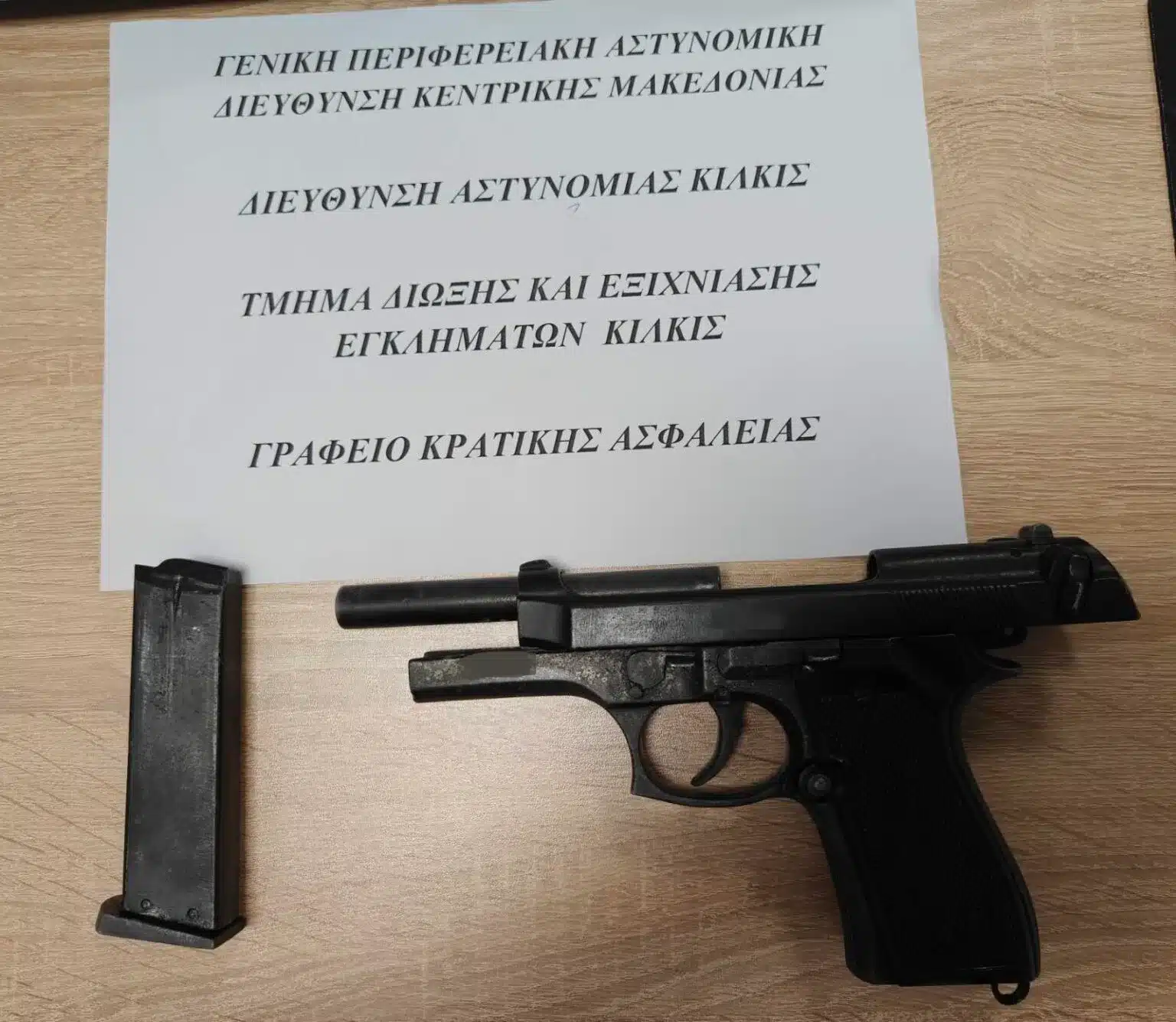 Κατά την έρευνα στην κατοικία του, οι αστυνομικοί της Διεύθυνσης Δίωξης και Εξιχνίασης Εγκλημάτων εντόπισαν και κατέσχεσαν ένα πιστόλι κρότου, το οποίο έφερε και γεμιστήρα.