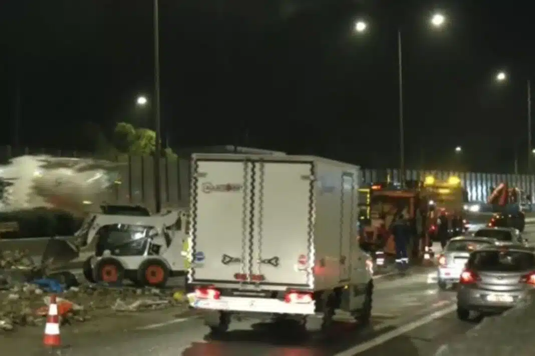 Από τα εμπορεύματα που έπεσαν στον αυτοκινητόδρομο έχουν κλείσει και τα τρία ρεύματα κυκλοφορίας και συνεργεία της Περιφέρειας Αττικής προσπαθούν να τα απομακρύνουν.