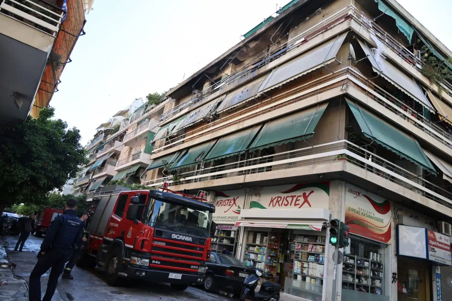 Η φωτιά εξαπλώθηκε ταχύτατα, με τις φλόγες να βγαίνουν από μπαλκόνια και παράθυρα, προκαλώντας ζημιές ακόμη και σε τέντες χαμηλότερων ορόφων.