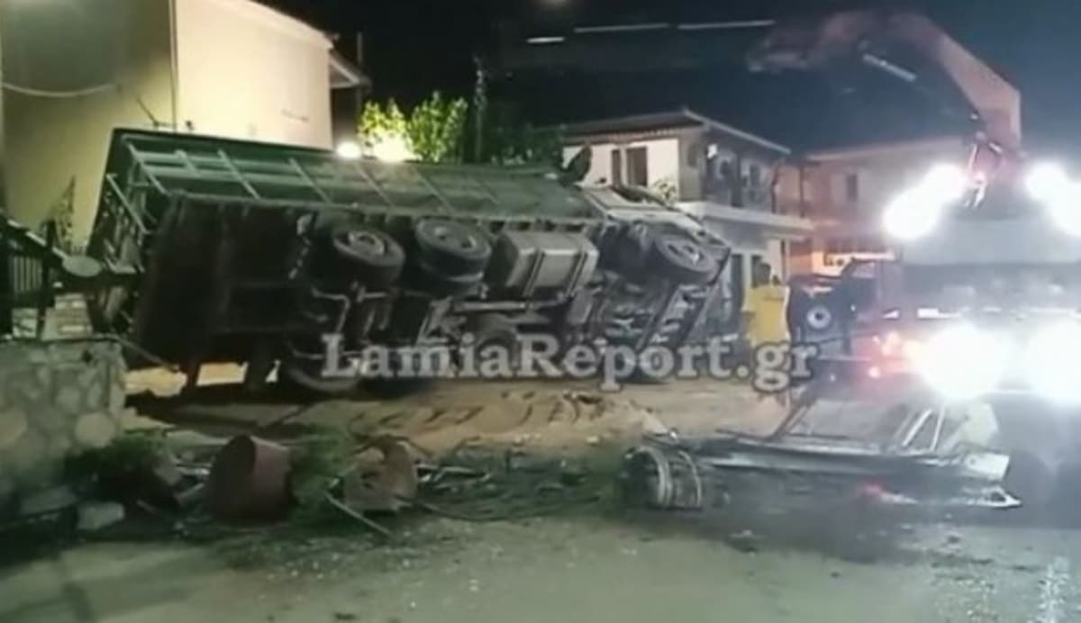 Το μεγάλο όχημα βρέθηκε τουμπαρισμένο στο πλάι και η πλατεία γέμισε σιτάρι το οποίο μάζευαν όλη νύχτα, σύμφωνα με το lamiareport.