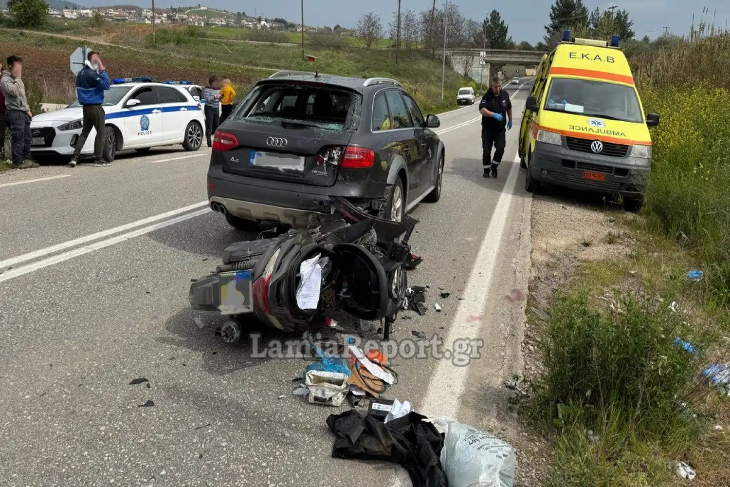 Σύμφωνα με το ρεπορτάζ του LamiaReport μπροστά από το δίκυκλο κινούνταν ένα αγροτικό όχημα και το αυτοκίνητο πάνω στο οποίο έπεσε το μηχανάκι.