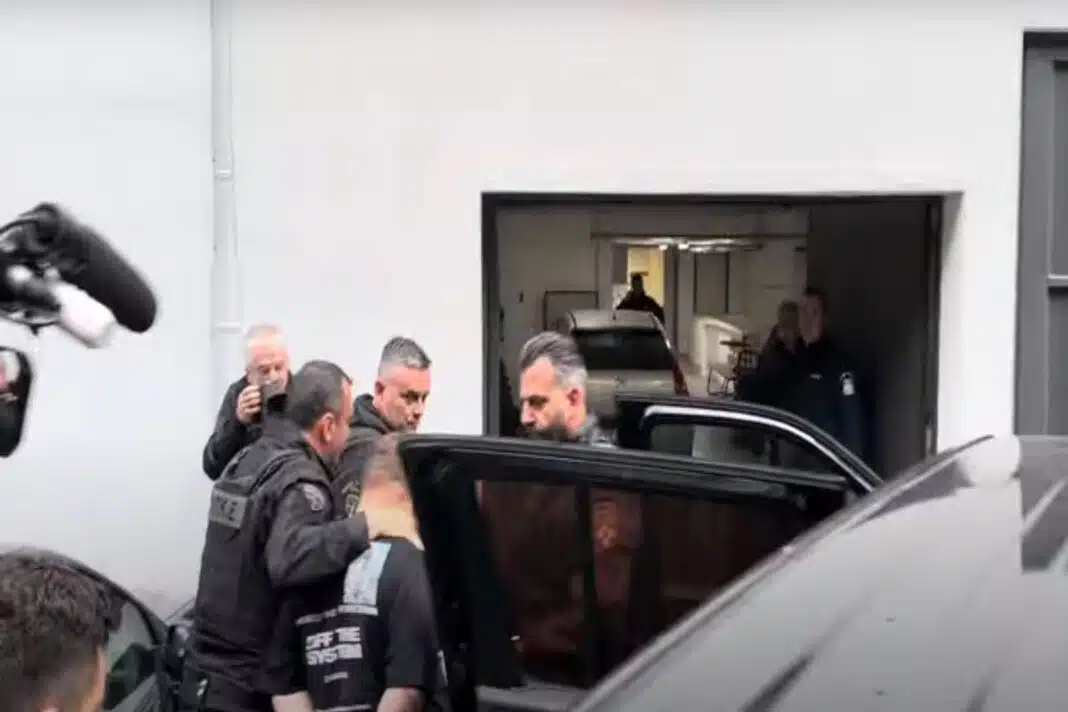 Ο δράστης έφτασε στα Δικαστήρια Λάρισας, με σκυμμένο το κεφάλι και αμίλητος, συνοδεία μεγάλης αστυνομικής δύναμης.