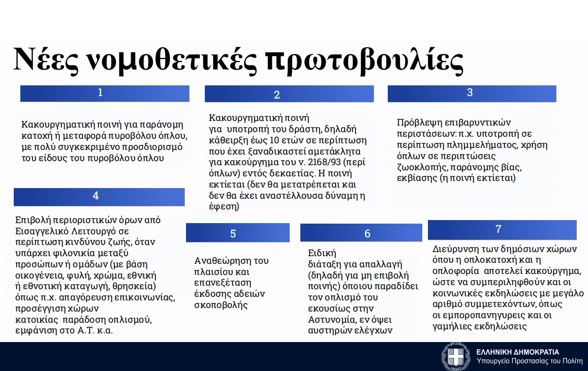 - Αναθεώρηση του πλαισίου έκδοσης αδειών οπλοφορίας. Εξετάζονται αλλαγές στις προϋποθέσεις και στις διαδικασίες απόκτησης νόμιμης άδειας.