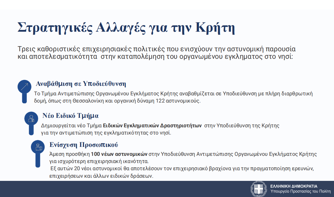 - Αναβάθμιση του Τμήματος Αντιμετώπισης Οργανωμένου Εγκλήματος Κρήτης – Η υπηρεσία ενισχύεται με 122 αστυνομικούς, αποκτώντας αυξημένες επιχειρησιακές δυνατότητες.