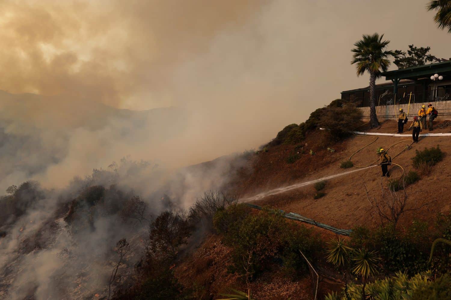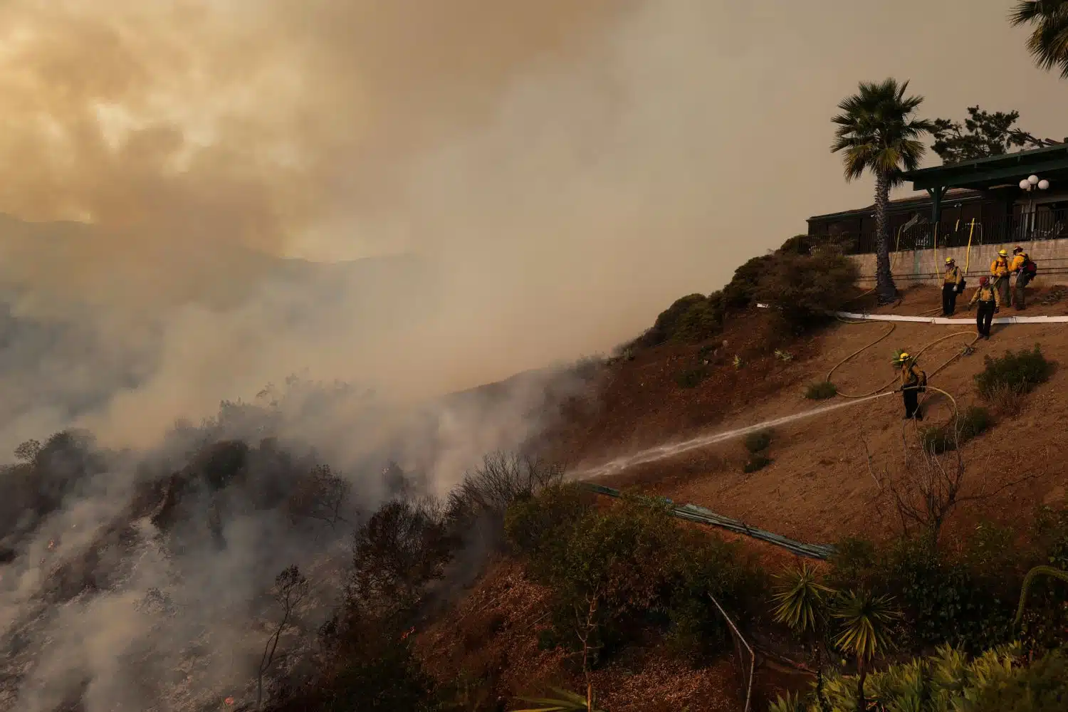 Διάσπαρτες φλόγες κατακαίνε τους λόφους με την εναέρια εικόνα να θυμίζει σκηνές ταινίας και το ελικόπτερο να πετάει μέσα από πυκνούς μαύρους καπνούς. Το βίντεο τραβήχτηκε στη διάσημη γειτονιά Πασίφικ Παλισέιντς και δημοσιεύτηκε από την πυροσβεστική υπηρεσία της πόλης.