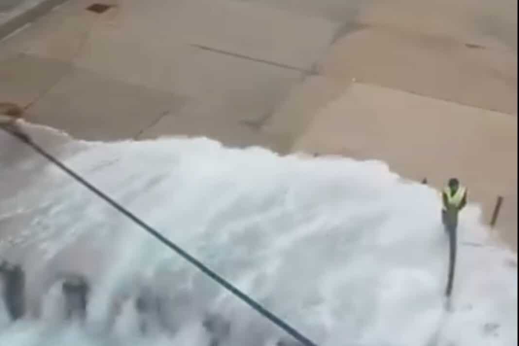Από τον έντονο κυματισμό που δημιουργείται, τόνοι νερού «πλημμυρίζουν» την αποβάθρα, την ώρα που εργαζόμενοι προσπαθούν να δέσουν τα σχοινιά στον κάβο.
