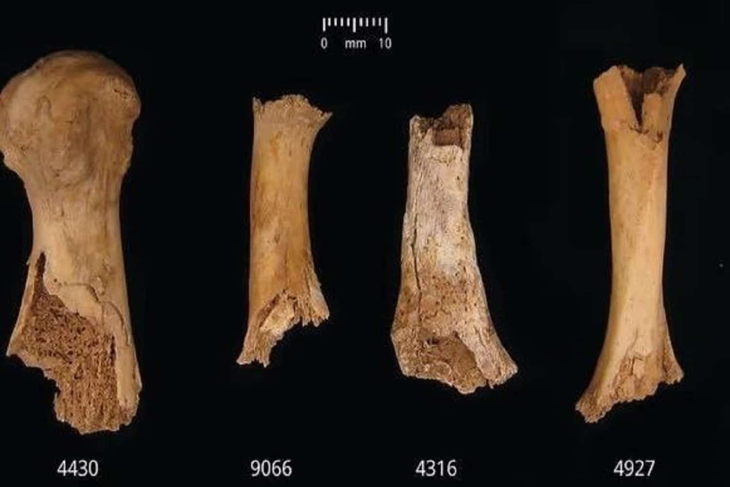 Τα σημάδια στα οστά των χεριών και των ποδιών δείχνουν ότι έχουν μασηθεί από ανθρώπινους γομφίους.