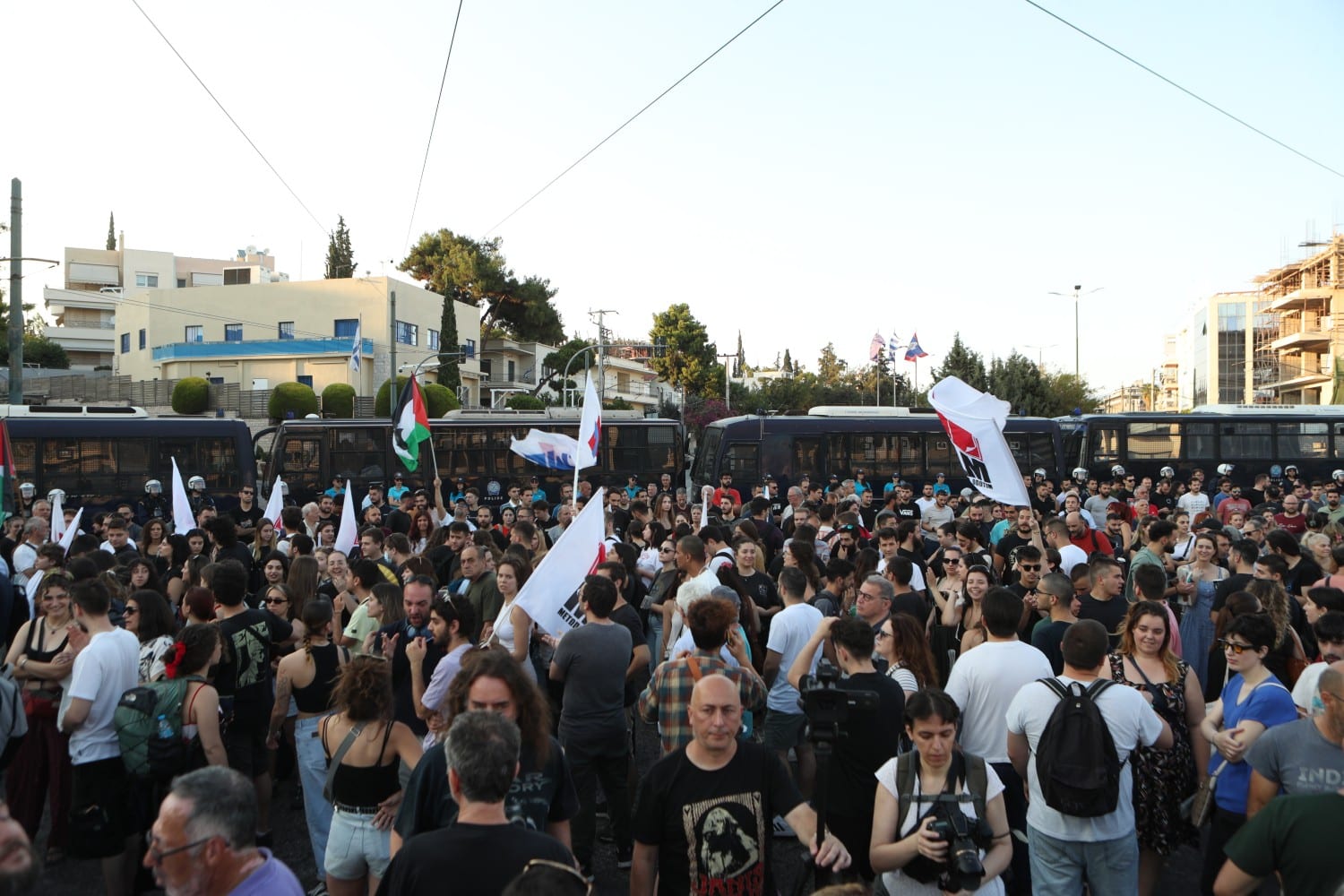 Όπως φαίνεται στις φωτογραφίες που δημοσίευσε η Eurokinissi, το ΠΑΜΕ έφτασε νωρίς το απόγευμα της Κυριακής στην ισραηλινή πρεσβεία, με αστυνομικές δυνάμεις να αποτρέπουν τον κόσμο από το να φτάσει στο κτίριο.