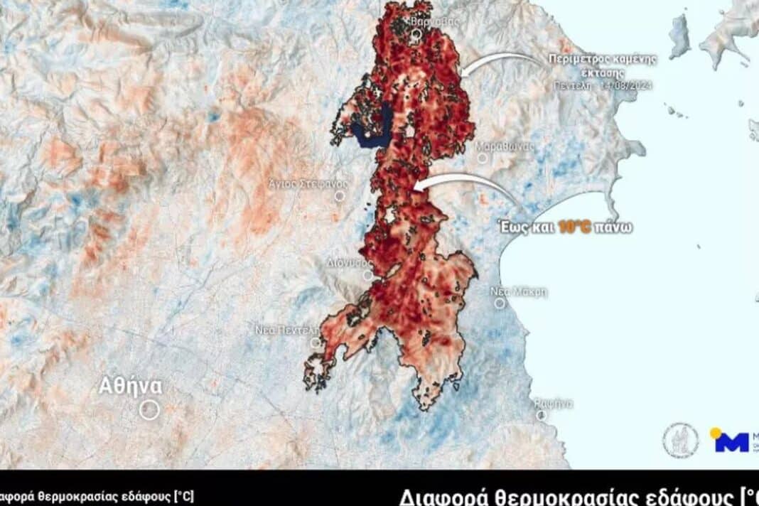 Αξιοσημείωτη άνοδος της θερμοκρασίας του εδάφους καταγράφεται σε περιοχές που έχουν πληγεί από πυρκαγιές, όπως προκύπτει από την ανάλυση δορυφορικών εικόνων από τη μονάδα Meteo του Εθνικού Αστεροσκοπείου Αθηνών.