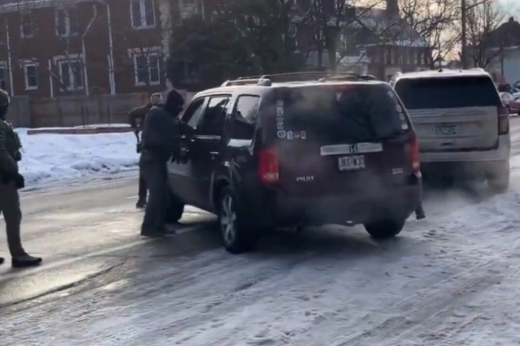 Στο βίντεο φαίνονται οι πράκτορες της ICE να πλησιάζουν ένα Honda Pilot και διατάζουν την οδηγό να βγει από το όχημα, αφού μπλόκαρε τον δρόμο.