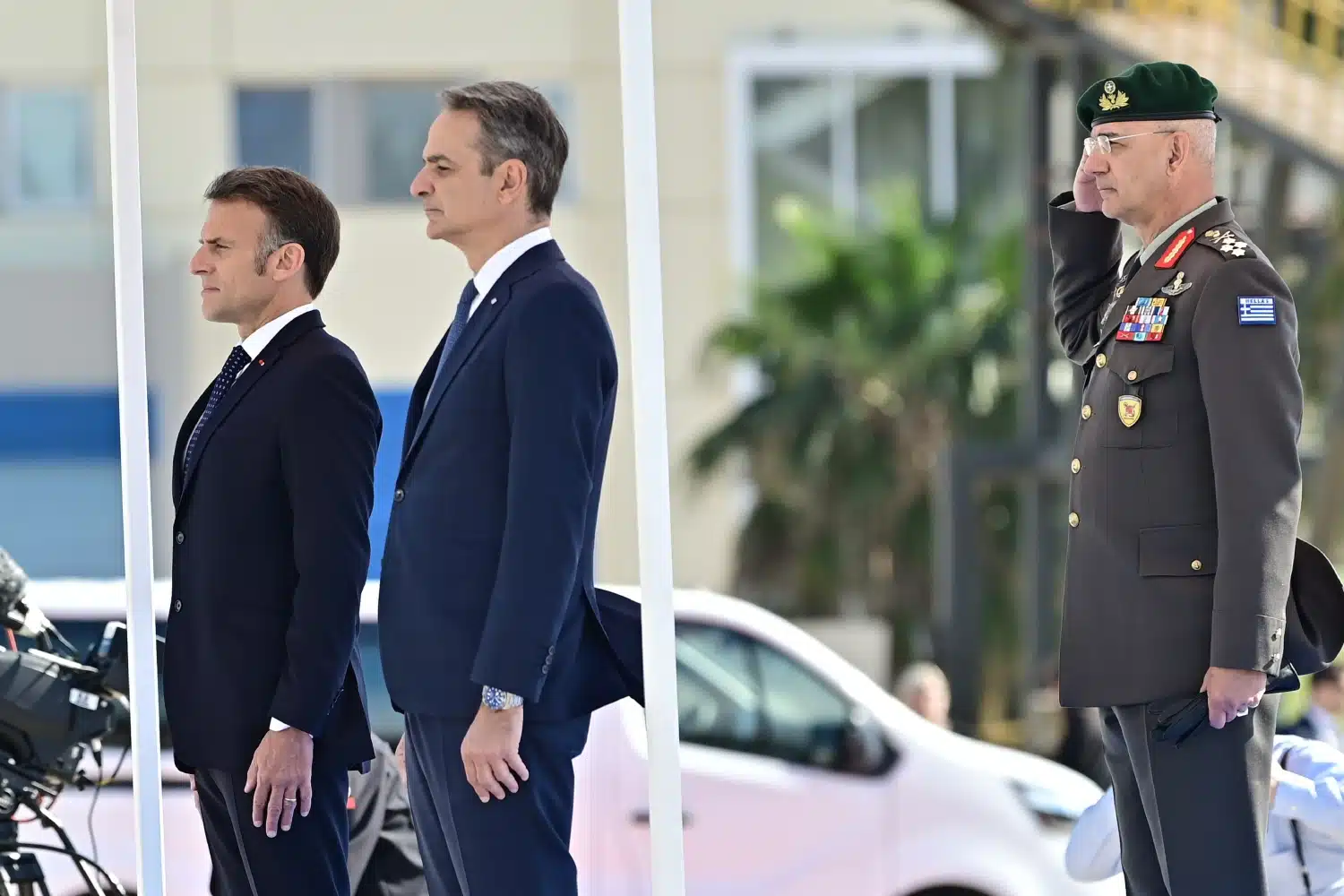 Ο Γάλλος Πρόεδρος έφθασε με αυτοκινητοπομπή, τον υποδέχθηκε ο πρωθυπουργός μαζί με τον υπουργό Άμυνας Νίκο Δένδια και τον αρχηγό ΓΕΕΘΑ.