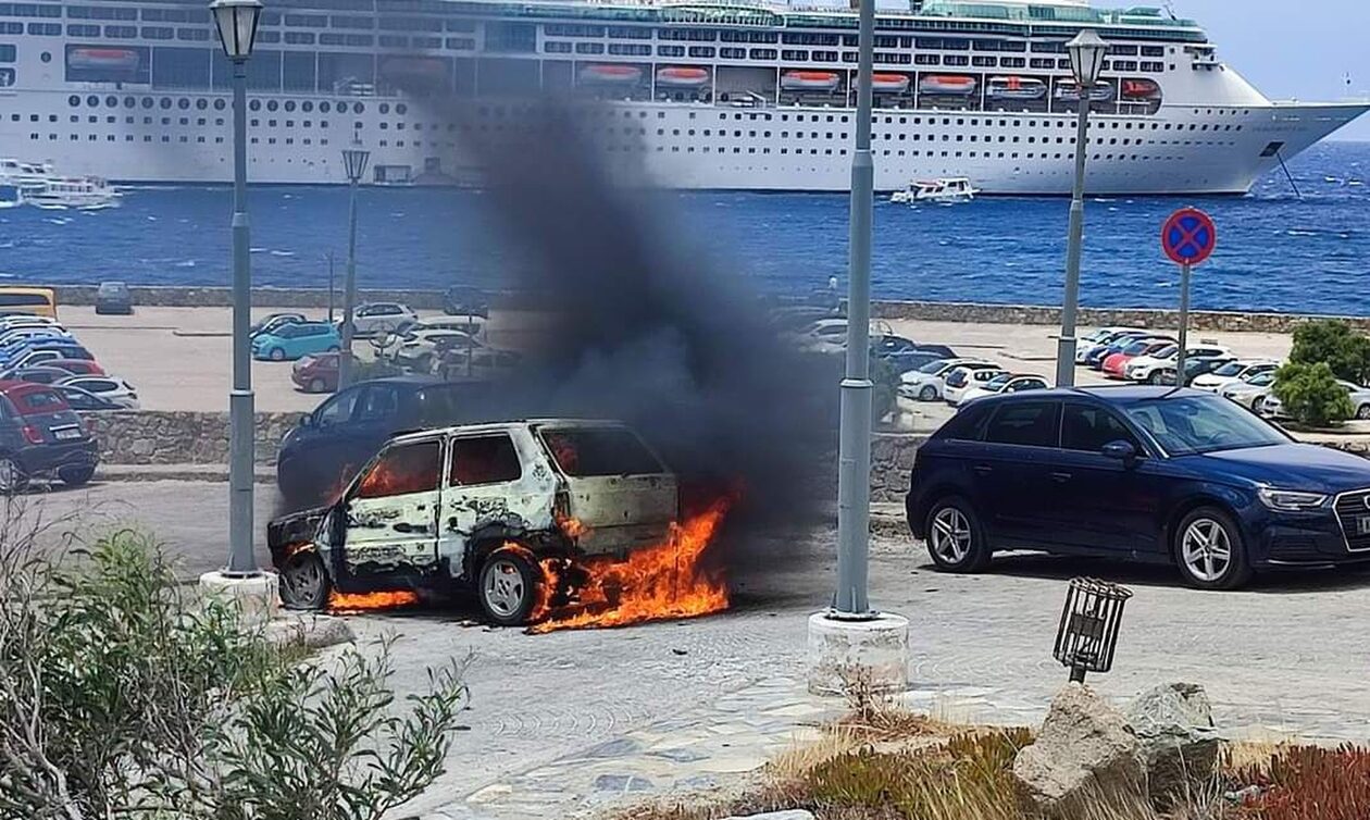 Ήταν δυο περίπου το μεσημέρι όταν ένα αυτοκίνητο Ι.Χ μικρού κυβισμού τυλίχθηκε στις φλόγες ενώ ήταν σταθμευμένο στο πάρκινγκ του παλιού λιμένα της Μυκόνου.