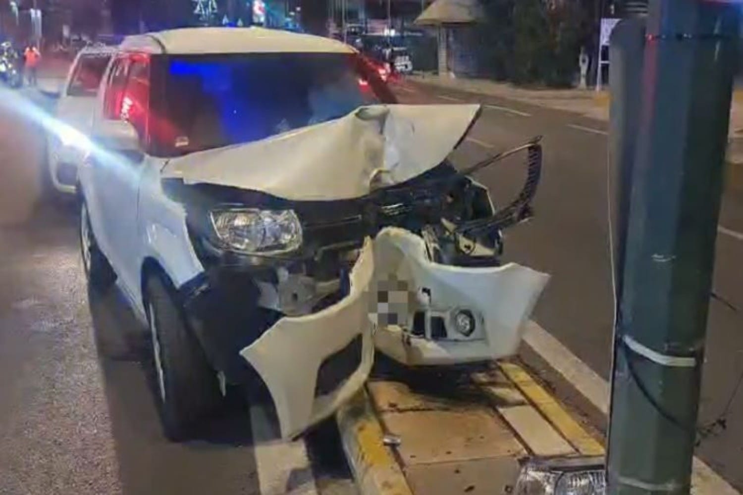 Η πρόσκρουση ήταν μετωπική και σφοδρή, με την κολόνα να «βυθίζεται» στο αυτοκίνητο, με συνέπεια να ανοίξουν οι αερόσακοι.